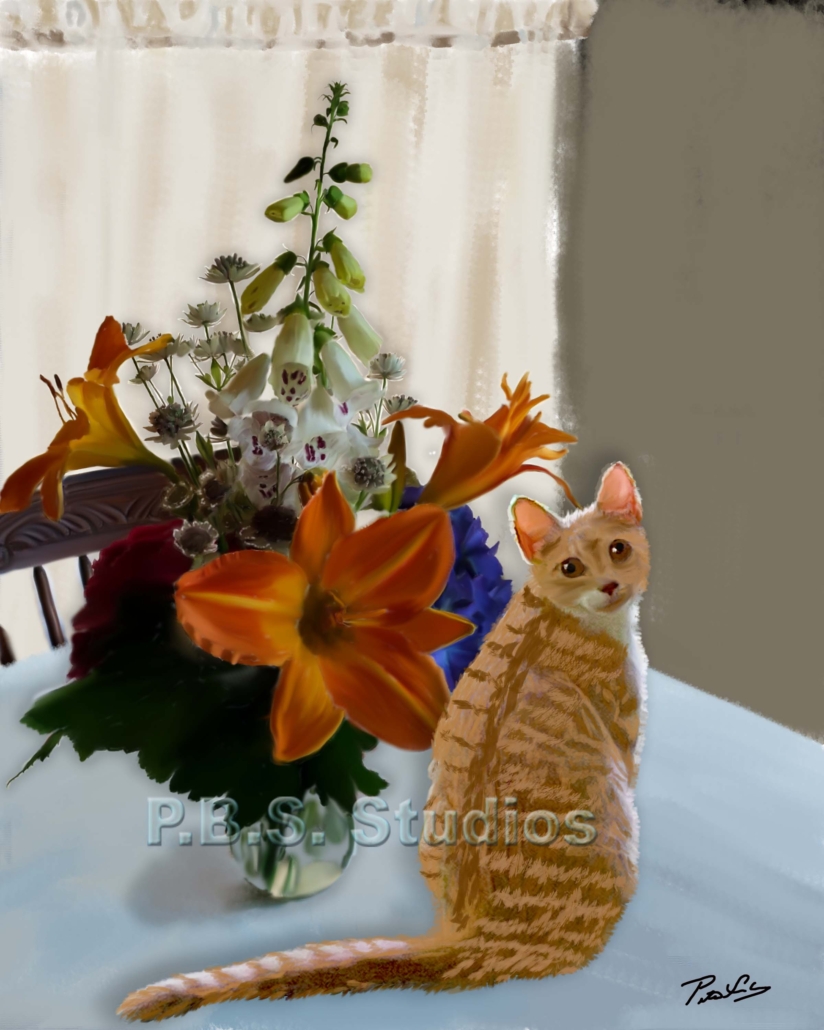 Here is one of my newest paintings combining a digital painting of my sister Beth’s flower creations with our newest kitten, Sunshine. I’ll be displaying a selection of my digital art. I’ll have framed and unframed versions of my digital paintings on display.